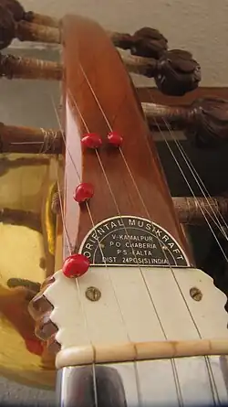 Another type is that designed by Allauddin Khan and his brother Ayet Ali Khan. This instrument, referred to by David Trasoff as the 1934 Maihar Prototype,[10] is larger and longer than the conventional instrument, though the fingerboard is identical to the traditional sarod. This instrument has 25 strings in all. These include four main strings, four jod strings (tuned to Ni or Dha, R/r, G/g and Sa respectively), two chikari strings (tuned to Sa of the upper octave) and fifteen tarab strings. The main strings are tuned to Ma ("fa"), Sa ("do"), lower Pa ("so") and lower Sa, giving the instrument a range of three octaves. The Maihar sarod lends itself extremely well to the presentation of alap with the four jod strings providing a backdrop for the ambiance of the raga. This variant is, however, not conducive to the performance of clean right-hand picking on individual strings. The instrument is typically tuned to C.