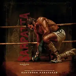 Sarpatta Parambarai's music and background score is composed by Santhosh Narayanan who renewed his association with Ranjith for the fifth time consecutively.[2][3] Since the film is based on the North Chennai backdrop as well as the boxing culture in the 1970s and 1980s, Santhosh admitted that the film is influenced by the aspects of his scoring techniques for Madras (2014).[4] To stay authentic to the music of that period, Santhosh chose to bring instruments used in the 1970s, instead of echoing film music from that era.[5] Since, the instruments used in that period were made of skin (contemporary instruments were replaced with fibre), he met veteran gaana musicians such as Rev Ravi and Gana Bala, who still had access to those instruments.[5] For the background score, Santhosh replicated the theme music of The Hateful Eight originally composed by Ennio Morricone, for this film.[6] The album and score is made with the mix of Tamil folk and brass instrument, as he was inspired by the music of Black Panther (2018), which fused African instruments with orchestral music.[5] As the film was shifted to digital release because of the COVID-19 pandemic lockdown, Santhosh had to make several changes in the sound mixing from theatrical mix to stereophonic sound.[7]