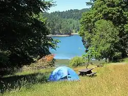 Gulf Islands National Park Reserve offers 7 walk-in (or kayak-in) backcountry campsites at Narvaez Bay. The trailhead to Narvaez Bay is located at the parking lot at the end of Narvaez Bay Road. There is also a bike rack available for cyclists to lock up their bikes. From the parking lot, there is a 1 km (0.6 mi) trail down to two beaches, Narvaez Bay and Echo Bay, and a side trail off to Monarch Head, which looks out to Boundary Pass and the San Juan Islands.[17] There is no potable water at Narvaez Bay, and no campfires are permitted, regardless of season.[18] Two private campgrounds offer year-round camping: Neither permits fires, however both offer access to potable water.