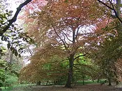 At the Three Oak Hill Drive crossroads, a track north-east points to Birch Copse (grid reference SU239662). Duke's Vaunt Oak (grid reference SU238664) is a notable tree approximately 1,000 years old. It was once hollow and 30 feet (9.1 m) in girth. In 1760 it had a door and a lock and was capable of sheltering "twenty boys".[19][Note 2] The tree is badly split now, but survives. Here the ground is damp and parts of Birch Copse barely see daylight. While some of the tall pines seem senescent, other plantation firs are green and vibrant. Many varieties of fungi can be seen in profusion in October, but dead-wood fungi are common enough throughout the year. At the southeast edge of the forest are good examples of Sweet Chestnut and Yew. At Holt Pound (grid reference SU248657) an avenue of oaks joins Birch Copse to Bedwyn Common (grid reference SU255652). This section of Savernake has its own avenue, London Ride, which at 1+13 miles (2.1 km) runs from St Katherine's Church (grid reference SU252649) to Upper Horsehall Hill Farm (grid reference SU261667). The ride is lined with oak in the south, and by limes in the north. Many old oaks and old sweet chestnuts are still standing, and foxgloves populate the forest edges. Forest tracks and bridleways lead southeast, and this is very much assarted[Note 3] countryside. When Stock Common (grid reference SU262644) is reached there are footpaths to Shawgrove Copse (grid reference SU270643), within sight of Great Bedwyn, or south to the rear of Tottenham Park by way of Bloxham Lodge (grid reference SU262637).