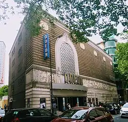 The exterior of the theatre retains many of the original 1930s details, although the wrought iron arch window on the frontage has been replaced by glass blocks. A sculptured frieze by British sculptor Gilbert Bayes, which runs across the building for nearly 130 feet (40 m), remains and represents 'Drama Through The Ages'.