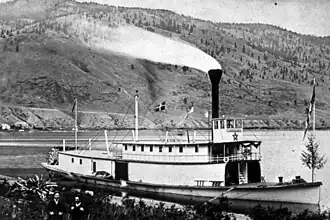 In 1872, the Canadian Pacific Railway (CP) built the small steamer SS Kamloops to carry supplies for surveyors from Savona. Mara and Wilson, Kamloops merchants, bought the Marten from the Hudson's Bay Company (HBC) in 1875.[39] The next year, the vessel smashed into the HBC warehouse, demolishing the east wing.[40] In 1877, the Marten was wrecked.[41]