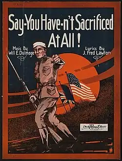 "Say, You Haven't Sacrificed at All! (March)", also written as "Say-You Haven't Sacrificed at All!" or "Say-You Have-n't Sacrificed at All!", is a World War I era song released in 1918. Most sources have attributed the role of composer to Will E. Dulmage and lyricist to J. Fred Lawton, as it is credited on the sheet music cover.[1][2] One source has their roles reversed, [3] and another source claims both composed the music.[4] The song was published by Chas E. Roat Music Co. of Battle Creek, Michigan. On the cover is a soldier with a head wound, pointing. Behind him are British, French, and American flags.[3] It was written for both voice and piano.[1]