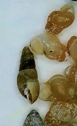 Sayella fusca found in Wellfleet, MA, with multiple minute hydrobia shells surrounding it