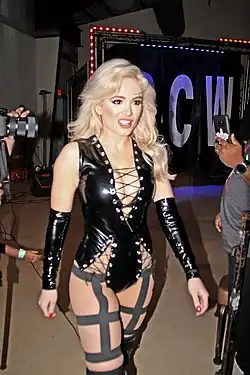 Bordeaux made her first appearance in WWE as one of Adam Rose's various colorful costumed party-goers named the Rosebuds at the Payback pay-per-view on June 1, 2014.[56] She later stated that she had performed as a Rosebud about 15 times by March 2015.[1] She made her WWE in-ring debut under the name Scarlett on the December 26, 2016 episode of WWE Raw, being presented as a local talent before losing to Nia Jax.[57] In September 2019, Bordeaux attended a private tryout at the WWE Performance Center in Orlando, Florida.[58] In November, WWE announced that they had signed Bordeaux to a contract and that she was set to report to the WWE Performance Center that same month.[59] She made her debut, reprising the Scarlett mononym ring-name from her 2016 one-off match, as the valet of her real-life boyfriend, Karrion Kross, on NXT on May 6, 2020, and continued to manage him throughout his run on the brand, including during his NXT Championship wins at TakeOver XXX and NXT TakeOver: Stand & Deliver.[60][61] On November 4, 2021, Scarlett was released by WWE along with Kross, as part of a seventh round of layoffs, due to the COVID-19 pandemic, that involved administrative staff, plant and talents of the franchise.[62]