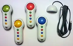 The game can be played with an Xbox 360 controller, but comes bundled with four special wireless controllers called Big Button Pads which resemble game show buzzers. Each controller has one large "buzzer" button at the top, the A, B, X, and Y buttons arranged vertically, and an Xbox Guide button.