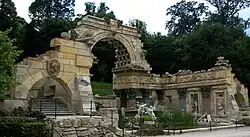 The area called Meidlinger Vertiefung (Engl.: depression of Meidling) to the west of the castle was turned into a play area and drill ground for the children of the Habsburgs in the 19th century. At this time it was common to use parks for the military education of young princes.[5] Whereas the miniature bastion, which was built for this purpose, does not exist anymore, the garden pavilion that was used as shelter still does. It was turned into a café in 1927 and is known as Landtmann's Jausen Station since 2013.[6]