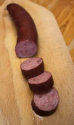 Schüblig are various heavily smoked sausages made throughout the German-speaking part of Switzerland as well as the Black Forest and Lake Constance areas of southern Germany. Made of pork[1] or beef, some schüblig are classified as dry sausage, while others are cooked smoked sausage. In Eastern Switzerland, Häsch Schüblig i de Ore? (have you got schüblig in your ears?) is a common saying when someone misunderstands and cannot make out what is being said.[2]