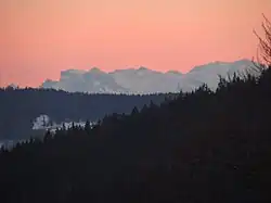 The summit of the Schauinsland is located in the district of Freiburg. The mountain is surrounded by towns such as Oberried, Munstertal, Bollschweil, and Horben (clockwise). The closest village to the summit is Hofsgrund. In Autumn especially, during a temperature inversion, there is a clear view of the Vosges mountains from the top of the Schauinsland. Under appropriate weather conditions there is a view of a large portion of the Swiss Alps.