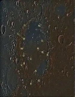 By convention these features are identified on lunar maps by placing the letter on the side of the crater midpoint that is closest to Schickard.