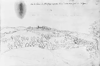 The plan was for a four-winged structure with four pavilion towers at the corners.[1] However, the work likely remained unfinished, as by 1691 only a three-winged complex with two towers existed.[1] The stables were built to the south of the castle.[1][2]