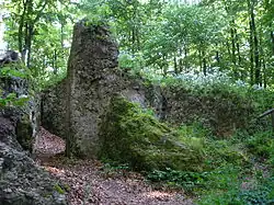 At the entrance to the castle, about 5.5 metres beyond the ditch in wooded terrain, is the outline of a square building with sides about 12 metres long. According to Kunstmann the wall thickness was about one metre. The southern half of the building was probably cellared, as is evinced by the vertically hewn rock face. The castle access ran over the bridge and then north past the probably tower-like building into the outer ward. The last remaining large section of surviving wall is in a rock crevice on the north side of the outer ward (Image 1). The three-metre-high retaining wall consists of five layers of hewn stone ashlars that are up to 50 centimetres wide.