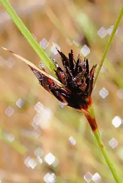Schoenus apogon, known as common bog-rush, is a species of sedge native to eastern Australia, New Zealand and Japan. A tufted annual grass-like plant growing to 55 cm tall. Often seen in seasonally wet habitats. A species of variable form, which may include more than one taxon. The specific epithet apogon is derived from Greek, meaning "no beard".[1][2]