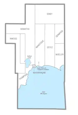 Schoolcraft County (/ˈsklkræft/ SKOOL-kraft) is a county located in the Upper Peninsula of the U.S. state of Michigan. As of the 2020 census, the population was 8,047, making it Michigan's fourth-least populous county.[3] The county seat is Manistique,[4] which lies along the northern shore of Lake Michigan. The county is named in honor of Henry Schoolcraft, who explored the area with the expedition of Lewis Cass.[1] The county was founded in 1843 and organized in 1876.[5] The county is largely rural and forested, with much of its western portion within Hiawatha National Forest.