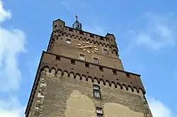The old castle has a massive tower, the Schwanenturm (Swan tower) 180 feet (55 m) high, that is associated in legend with the Knight of the Swan, immortalized in Richard Wagner's Lohengrin.
