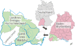 ![]() Map of the location of the Schwarza in Germany, Baden-Württemberg, and in and near the Districts (Singular in German: Landkreis) of Breisgau-Hochschwarzwald, Waldshut und Lörrach | |