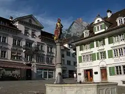 According to the chronicle of Johann Stumpf from 1548, the old town originally consisted of a village square, the church and its cemetery, the town hall, the inn, the archive tower and a number of scattered wooden houses. Around 1500, to distinguish it from the Canton of Schwyz, Schwyz town was often called Kilchgassen, which meant the village around the church but not the surrounding villages. The fire of 1642, which destroyed 47 buildings in the center of the village, allowed the town to be totally rebuilt. A new, larger town square with major roads radiating out was built in front of the new church and the new city hall. The houses were rebuilt as urban townhouses and a ring of about 30 large patrician farm houses grew up surrounding the village center.[9]