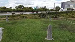 The park borders the Furnace Street Substation, an electrical substation noted for containing three 16-ft-tall stone monoliths evocative of Stonehenge. The monoliths, known as Needles of Stone or Pillars of Stone, were installed in 1989, the year the substation opened. They were commissioned by the Columbus Division of Power, which paid Ohio State University landscape architecture students to design a work to bring attention to the facility and spur curiosity, especially given its prominent visibility from I-70 and I-71. The works were constructed by city staff. The works are separated from the park by a fence, separating them from public view by about 100 feet (30 m).[10]