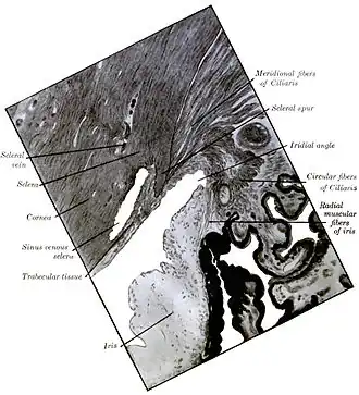 It is the origin of the longitudinal and circular fibres (which swerve acutely from the spur to run circumferentially, as a sphincter near the periphery of the lens)[1] of the ciliary muscle, and is attached posteriorly to the trabecular meshwork.