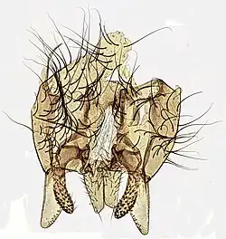 The body length is 5.5 to 10 mm. It is characterized by the presence of setae on the propleura, usually one pair of setae on the prothorax, hairy mesopleura and numerous hairs at the base of the rear notopleural setae.For terms see Morphology of Diptera.