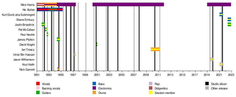 - Mick Harris - electronics (1991–1997, 2000–2011, 2019–2022), drums (1991–1994), backing vocals (1991–1992)