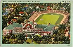 Jesup Wakeman Scott High School is a public high school located in the Old West End neighborhood of Toledo, Ohio. It is part of Toledo Public Schools. It was named for a former editor of The Toledo Blade from 1844 to 1847. Scott was an entrepreneur, philanthropist and well-known civic leader who envisioned Toledo as the "Future Great City of the World." The current high school building was built in 1913.[4]