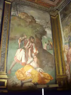 The Confraternity built the Scoletta in 1427 and it was expanded in 1504 with the Sala Priorale (Prior's Room) decorated with a cycle of fifteen frescoes and three canvases, which were worked on by the young Titian between 1510 and 1511. He was entrusted with three frescos of miracles performed by Anthony of Padua, The Miracle of the Newborn, The Miracle of the Healed Foot and The Miracle of the Jealous Husband. The three large frescoes were painted by him between April and December 1511 in the main room of the Scuola del Santo – they were his first large-scale independent work. The raised arm of the wife in Husband is sculpted in relief rather than painted illusionistically.[1]