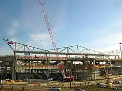 On September 22, 2006, Sound Transit and the Port of Seattle broke ground on the Airport Link extension, beginning three years of light rail and roadway construction.[48][49] The airport's return-to-terminal ramps were closed for demolition in October, clearing the site of the future station.[50] Construction of the SeaTac/Airport light rail station was bid out to Mowat Construction for $35.8 million in July 2007; the initial bid in March was set above Sound Transit's estimates at $95.3 million by Mowat, the sole bidder, and subsequently reduced the scope of the contract and removed elements of the station to bring costs down.[51][52] A second contract signed with Mowat in February 2008 brought the total cost of the station's construction to $72 million.[53] The 1.7-mile-long (2.7 km) light rail guideway approaching the station would be built by PCL Construction as $38 million addition to their contract to build the guideway in Tukwila.[54]