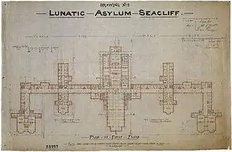 Seacliff Asylum was one of the most important works of Robert Lawson, a New Zealand architect of the 19th century. Known for designing in a range of styles, including the Gothic Revival,[7] he started work on the new asylum in 1874, and was involved with it until the completion of the main block in 1884. At that time, it was New Zealand's largest building, and was to house 500 patients and 50 staff.[8] It had cost NZ$78,000 to construct.[4]
