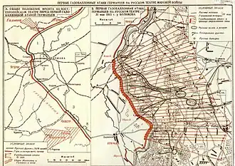 On the night of June 12, Prince Leopold of Bavaria ordered a repeat gas attack. Preparations were reduced as Russian troops launched nightly attacks to recapture lost sections of the position, but the number of heavy batteries increased to 24. The release of gas followed an hour's artillery preparation at 3.30. but a changing wind carried the cloud to the German trenches. The launch was cancelled, only 4,500 cylinders were emptied. The infantry attack was launched at 5 o'clock; by 8 o'clock the Russian positions were in the villages: Zakrzhev, Kornelin, Zhilin and Kozlov-Biskupy were captured, the Germans entrenched themselves on the embankment of the Warsaw-Vienna Railway and on June 12–13 held the occupied space, repelling all counterattacks.[15] Despite this, the German command was extremely dissatisfied with the result of the attacks, despite some tactical success, not a Single unit completed its tasks and the Russian defense was still impregnable.[17]