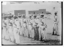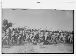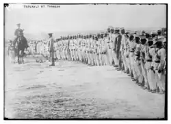 After an old Maderista, Felipe Ángeles, who was an excellent artillery gunner and was highly regarded by Villa, joined the division in mid-March,[10] on March 16 the division set out for Torreón.[11] The army of thousands of people traveled in countless train cars and horses, and more and more people joined them on the way.[12] Horses were also transported inside the carriages, and people were crowded on the roofs, but there were also makeshift kitchens on top of the wagons. They also loaded 29 cannons and 1,700 grenades on the trains.[11] There was a reconnaissance train in front, followed by a train with materials and equipment for rail repairs, then horse-drawn carriages, food wagons, then 40 white-painted hospital wagons, then cannon carriers, and finally passenger cars assigned to infantry and officers.[13]