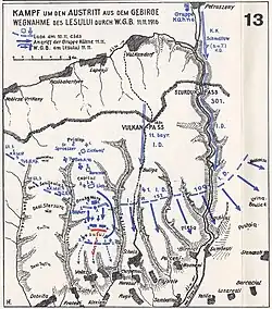 There is considerable disagreement between the German and Allied versions of the lead-up to the German breakthrough at the Jiu Valley. The Russian General Staff stated on 22 November that the German plan against Romania had completely failed, that Falkenhayn had failed at Predeal, and that he could only overrun Wallachia, instead of cutting it off in a pincer movement.[14] The German semi-official comment, however, claimed that it had never been the intention of their Supreme Command to break through in the southeastern Carpathian passes, trying to make out – in reaction to their defeats in the passes south of Brassó (Brașov) and on the Moldavian frontier – that these had always been part of a maneuver which aimed at attracting and binding Romanian forces in an area away from the Jiu Valley, the place singled out for the main attack. The truth was probably that the German Supreme Command acted on a plan which, if successful, would have achieved an overwhelming victory, but even if only partially carried out, would have given them the means to achieve remarkable though less overwhelming successes.[4]: 435 With the eastern Carpathian passes eliminated, the southern route from Brassó (Brașov) to Bucharest and the Danube offered the greatest potential for crushing the Romanian Army. Both the German and Austro-Hungarian commands favored this approach. However, the Romanians expected their enemies to choose that route, and accordingly they had constructed formidable defenses in the passes south of the city before the war started. Taking into consideration the worsening weather and the situation of the railways, Erich von Falkenhayn decided to achieve his breakout in the westernmost mountain passes. That being said, Falkenhayn had not entirely given up hope of breaking through the Romanian defenses south of Brassó (Brașov). He sent his divisions east and south of the city to both keep pressure on the Romanians and — with luck — break through the Romanian defenses. General Curt von Morgen, one of Falknehayn's subordinates, argued that much more of the Romanian Army could have been captured if a breakthrough would have been achieved at Câmpulung instead of the Jiu Valley. He insisted that this would have achieved "a real victory, a Cannae, a Tannenberg".[3]: 156–157, 300 Falkenhayn planned to apply pressure at several different points across the mountains and then exploit a success wherever it was achieved.[5]: 370–371