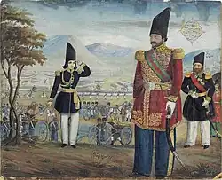 Soltan Morad Mirza was an ideal candidate to lead the Qajar army. One of Abbas Mirza's 26 sons, Morad Mirza was a notably proud Qajar Prince.[6] Of note among his characteristics, Soltan Morad Mirza's anti-British sentiments supported his candidacy given Tehran's diplomatic fallout with London at the time. He was a seasoned commander in the aftermath of the Revolt of Hasan Khan Salar. Amid the scramble to retake Mashhad, Soltan Morad Mirza was declared the new Governor-General of Khorasan. He was dispatched at the head of one of two armies with a force of 7,000 and four artillery pieces.[7] The war with Salar, who was Morad Mirza's cousin, would soon turn into one of attrition and the commander would remain behind Mashhad's walls until March 1850.[6] Following the revolt, Naser al-Din Shah bestowed the title of Hesam o-Saltaneh (Sword of the Kingdom) upon his uncle.[6] Thus, the Qajar Imperial Court decided that an army under Morad Mirza Hesam o-Saltaneh was to push forward with all speed to secure Herat and avoid its potential capture by Dost Mohammad Khan.[2] The Persian government tried to justify this action with a manifesto published through the Tehran Gazette.[2] The manifesto proclaimed that Dost Mohammad would march on Herat and later invade Khorasan. With this narrative, Tehran claimed that its actions were only in defense of its own institutions and the maintenance of its territorial integrity and that the army dispatched to Herat was to "rescue that Kingdom from the grasp of Dost Mohammad."[2]