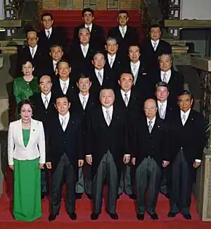 ![]() Prime Minister Yoshirō Mori (front row, centre) with his reshuffled cabinet inside the Kantei, January 6, 2001 | |