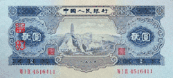 The second series of Renminbi banknotes was introduced on March 1, 1955 (but dated 1953). Together with the introduction of the second series, the decimal point was moved 4 places to the left. As a result, one first series ¥10,000 note is equivalent to one second series ¥1 note.
