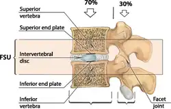 Functional spinal unit (FSU). Approximately 70% of applied axial compression is transmitted by the vertebral body and the intervertebral discs, with the remaining 30% of the load being distributed through the facet joints