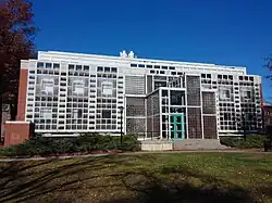 The Seeley G. Mudd Chemistry Building was designed in the postmodern style.[22] The structure's exterior walls were constructed from limestone and brick that surround regular glass blocks,[11] each about 4 inches (10 cm) thick with side lengths ranging from 8 to 12 inches (20 to 30 cm).[23] The brick and limestone walls faced the west, north, and east, while the southern face was primarily glass, a feature designed for efficient energy use; when sunlight hit the wall, air rose into the building and was heated, then pumped throughout where it aided in the operation of the structure's 46 fume hoods.[24] The north wall, meanwhile, was designed to be resistant to cold air.[25] The building was well insulated and its plain outer walls were as uninterrupted in material as possible to keep as much warm air inside the structure as possible in winters.[26]
