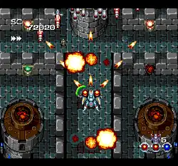 In addition to the elemental orbs, a flashing orb can be collected, which destroys enemies on-screen and grants a shield to protect the Spriggan from enemy hits.[1] The title uses a respawn system where players immediately starts at the location they died at. Getting hit by enemy fire or colliding against solid stage obstacles will result in losing a live, as well as a penalty of decreasing the ship's firepower to his original state and once all lives are lost, the game is over. Besides the main mode, there is also a score attack mode as well, where the player is tasked with reaching the highest score possible by destroying enemies.[1][2]