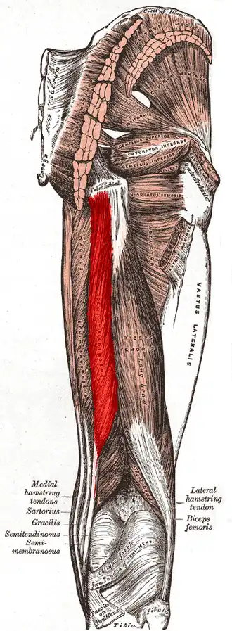 The muscle also helps to medially rotate the tibia on the femur when the knee is flexed and medially rotate the femur when the hip is extended. It counteracts forward bending at the hips as well.[1]