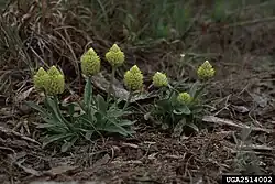 Senega nana, commonly known as candyroot or low bachelors' buttons, is a small species of herbaceous plant native to the south-eastern United States. The root has a sweet liquorice flavor when it is chewed, but it is usually hidden underground until the plant flowers. The seeds of candyroot are dispersed by ants.
