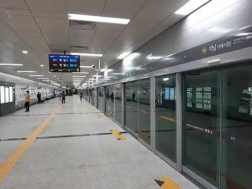 Seongnam Station (석남역) is a subway station on Incheon Subway Line 2 and Seoul Subway Line 7. It first opened as a station on Incheon Subway Line 2 solely in 2016, and Seoul Subway Line 7 opened in May 2021. Despite their identical spelling in the Roman script, the station is not located in the city of Seongnam (성남) southeast of Seoul, as their names in Hangul differ by one letter.