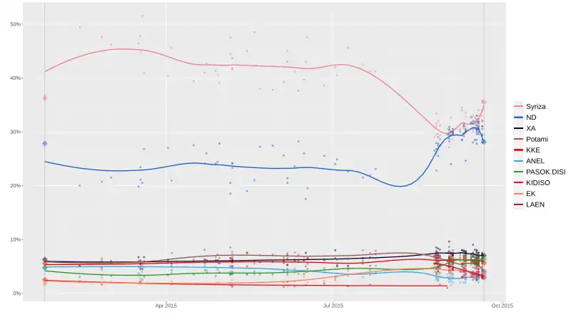 - ^ "Ντέρμπι στις κάλπες δείχνει και νέα δημοσκόπηση - Μικρό προβάδισμα για ΣΥΡΙΖΑ". thestival.gr (in Greek). 5 September 2015.
