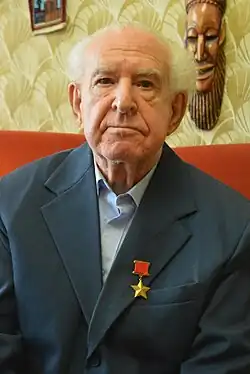 He retired in December 1991 with the rank of polkovnik, the Soviet equivalent to colonel, and settled in Moscow.[1] Over his career he had received the title of Hero of the Soviet Union, the Order of Lenin and the Order of the Red Banner, as well as the Order of the Patriotic War First Class, the Order of Glory Third Class, and various medals, including those "For Battle Merit", "For the Victory over Germany in the Great Patriotic War 1941–1945", "For the Capture of Berlin", and "For the Liberation of Warsaw".[1][4][3] He joined the United Russia political party on 19 February 2013.[5]