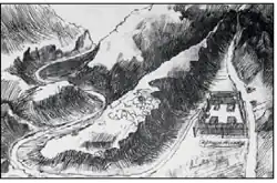 So-called Serpantinka was located near the village of Khatenakh or Khatynnakh,[7] now non-existent (not to be confused with a village in the Sakha Republic). Presumably, it was located in the place where the road from this village towards the village of Yagodnoye twisted along the slopes (serpantine is the Russian name for a hairpin turn). Nearby flows a stream called "Sniper".[8] One of the testimonies, that Robert Conquest cites, claims that on the site of the future camp there were a few barracks, called Serpantinnaya, in which the road-building unit had been located. By the time the NKVD decided to use this place for setting up a camp, the road was completed and the place had been empty for over a year.[9]