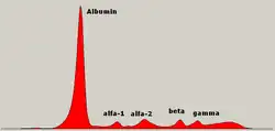 Serum protein electrophoresis (SPEP or SPE) is a laboratory test that examines specific proteins in the blood called globulins.[1] The most common indications for a serum protein electrophoresis test are to diagnose or monitor multiple myeloma, a monoclonal gammopathy of uncertain significance (MGUS), or further investigate a discrepancy between a low albumin and a relatively high total protein. Unexplained bone pain, anemia, proteinuria, chronic kidney disease, and hypercalcemia are also signs of multiple myeloma, and indications for SPE.[2] Blood must first be collected, usually into an airtight vial or syringe. Electrophoresis is a laboratory technique in which the blood serum (the fluid portion of the blood after the blood has clotted) is applied to either an acetate membrane soaked in a liquid buffer,[3] or to a buffered agarose gel matrix, or into liquid in a capillary tube, and exposed to an electric current to separate the serum protein components into five major fractions by size and electrical charge: serum albumin, alpha-1 globulins, alpha-2 globulins, beta 1 and 2 globulins, and gamma globulins.