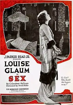 Sex is a 1920 American silent drama film directed by Fred Niblo, written by C. Gardner Sullivan, produced by J. Parker Read, and starring Louise Glaum.[1] On its surface, the film was a morality story on the evils of marital infidelity. However, the film's producer, J. Parker Read, had made a series of pictures on sex themes. The release of Sex, with its provocative title and explicit scenes of seduction and debauchery, made it the subject of controversy among censors and commentators.