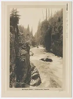 The Seymour River has been the main water supply for North Vancouver since 1907.[2] The first intake was built in 1907 and the first Seymour Dam was constructed in 1927.[3] The present day Seymour Falls Dam was constructed 1961. Up to 40,000 fed coho fry are released above the dam each year by the Seymour Salmonid Society.