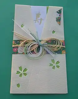 A shūgi-bukuro (祝儀袋, lit.'celebratory gift bag') is a special envelope in which money is given as a gift of celebration in Japan, especially at weddings or other auspicious occasions, such as a birth or celebrating a new home.[1][a] The giver inserts the money into a shūgi-bukuro on which they have written their name, and the amount of money inside. In the case of weddings, the shūgi-bukuro is handed to the receptionist of the reception party; otherwise, the money is collected by the person themselves, with the envelopes acting as a record of who gave money and how much they gave.[1] Shūgi-bukuro are sold at supermarkets and stationery stores.