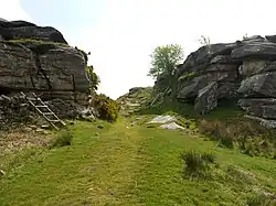 ![]() Salters Nick, running through Shaftoe Crags, viewed from the north-west. The remains of the Iron Age and Romano-British settlement are on the right, above the crags. | |