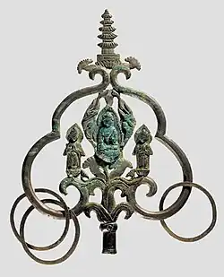 The basic design of a khakkhara is of a central staff, normally in wood, topped by a finial in metal, with a looped design, from which smaller metal rings hang on each side (similar to the stringing of traditional Chinese cash).[3] Various numbers of loops and rings are employed, with each number being assigned symbolic significance on the basis of a variety of Buddhist numerical formulas.[3] Historical examples from the Famen Temple include staffs with one, two, or four loops and four, six, or twelve rings on each loop.[3]